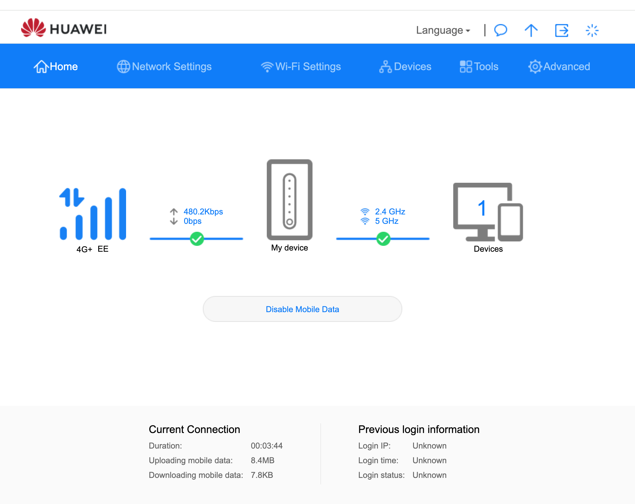 - Enter the address as http://192.168.8.1 when it finishes loading it should look like the below.